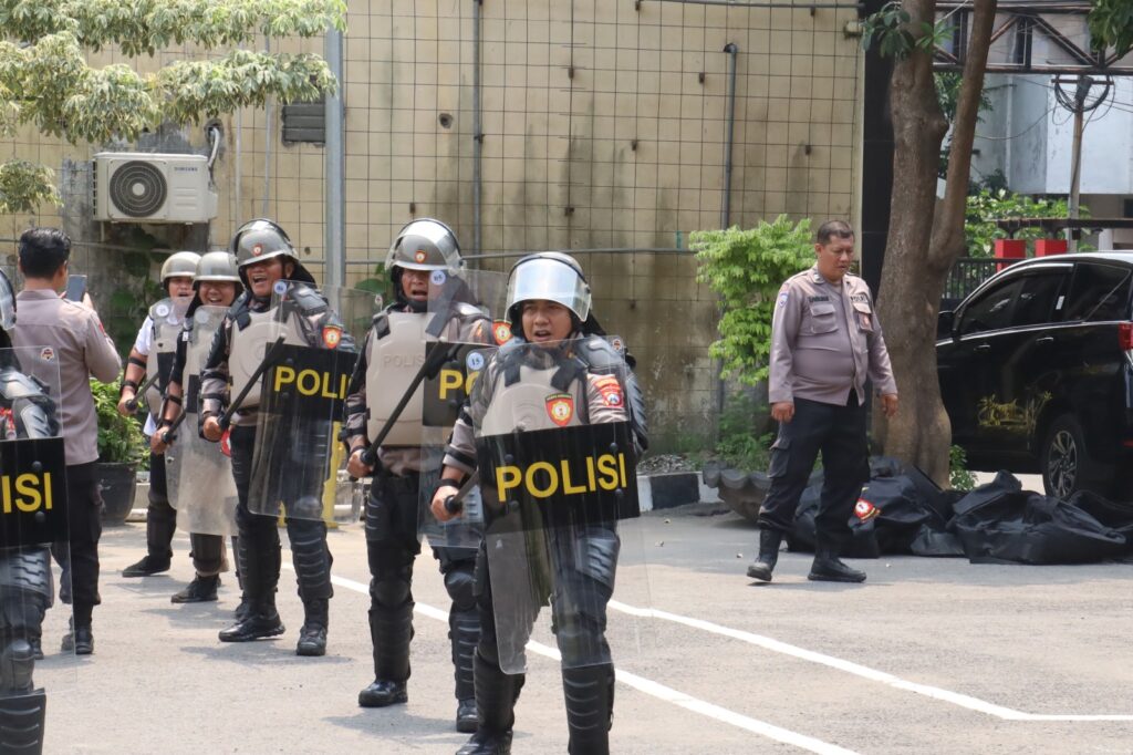Bukan sekadar peninjauan, AKBP Wahyu Hidayat ikut membaur, mengangkat tameng, dan melakukan simulasi formasi pengamanan massa.