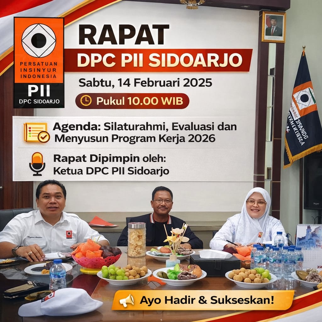 IBN.com SIDOARJO – Pengurus Cabang (PC) Persatuan Insinyur Indonesia (PII) Kabupaten Sidoarjo menggelar rapat silaturahmi dan evaluasi program kerja, Sabtu (14/2/2025), pukul 10.00 WIB sd selesai.